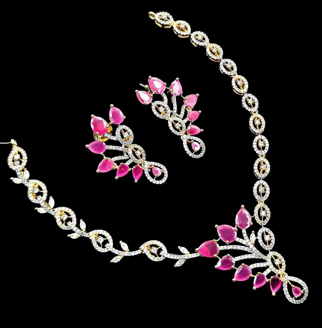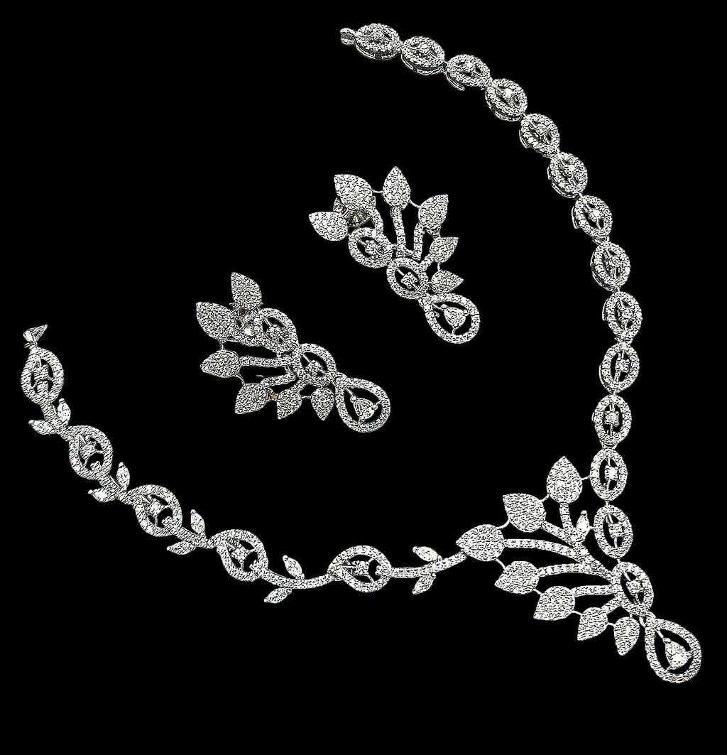Elevate your style with this stunning silver jewelry set, featuring a delicately handcrafted necklace and matching earrings. Each piece showcases intricate leaf motifs adorned with sparkling stones, reflecting timeless elegance and exceptional craftsmanship. The set makes a perfect accessory for weddings, parties, or simply adding a touch of sophisticated glamour to your everyday look. Necklace length: 18 inches. Earrings: 1.5 inches drop. Color: lustrous silver with clear stones. Treat yourself or gift someone special—this set comes beautifully packaged, ready for any occasion.