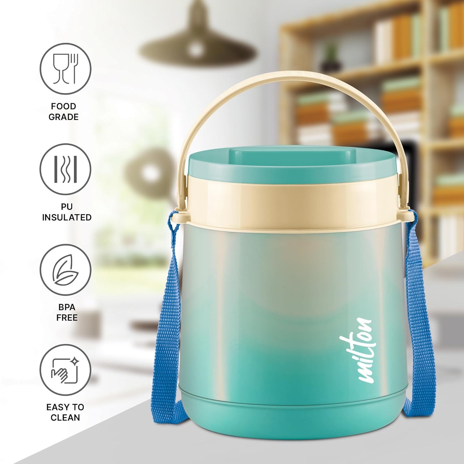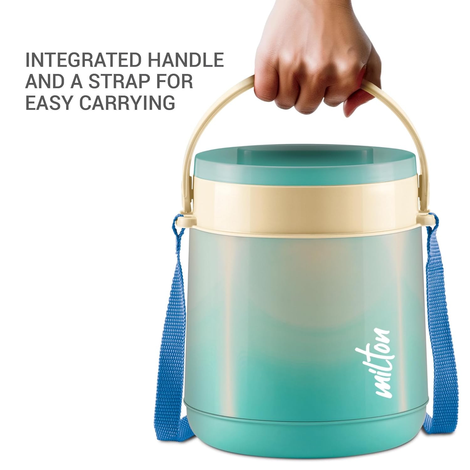 • Color: Aqua Green; Material: Steel Containers, Plastic Insulated Lifter; Package Content: 1 - Piece Gradient Tiffin 3 (900 ml); Dimension in cms (L x W x H): 15.6 x 15.6 x 18.8