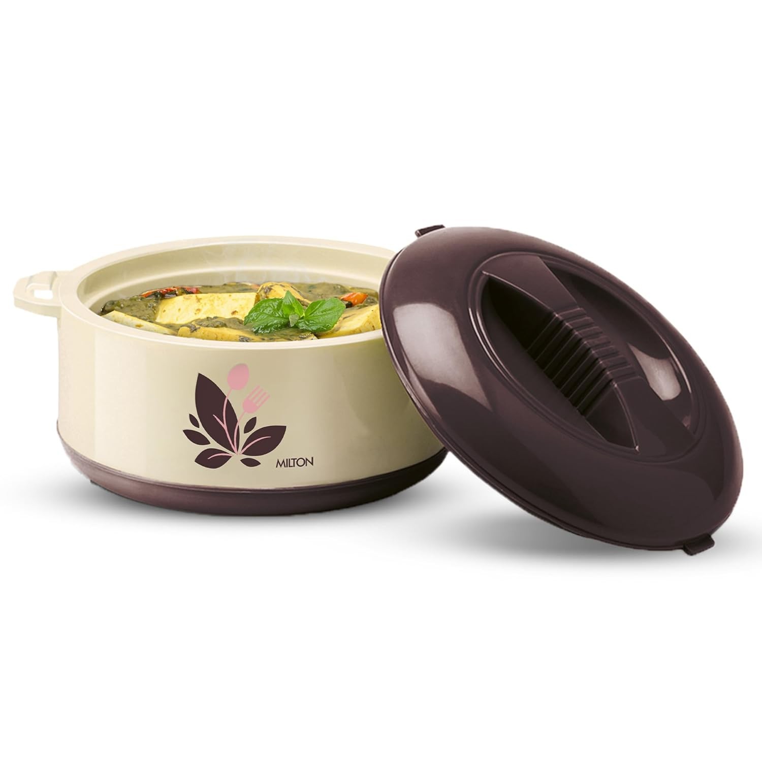 • Contemporary dual-tone outer finish with attractive graphics make mealtimes fun and exciting. Easy to carry from kitchen to dining table with an eye catching design featuring inner stainless steel