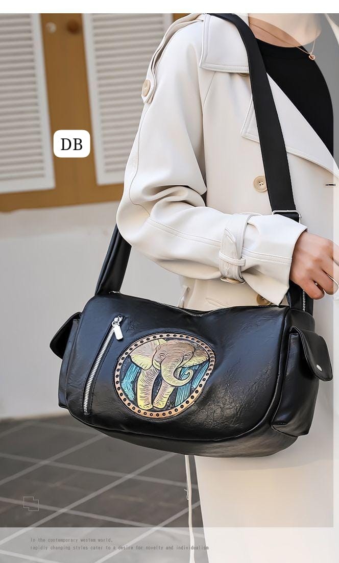 Elevate your everyday style with this sophisticated black shoulder bag, featuring a vibrant embroidered elephant patch that adds a touch of artistry and charm. Crafted with sturdy shoulder straps for all-day comfort and a spacious front zipper pocket for easy access to your essentials, this bag seamlessly combines functionality with eye-catching design. Ideal for daily use, the generous size accommodates your wallet, phone, and more while the timeless black color matches any outfit. Treat yourself or gift someone special to this unique statement piece.