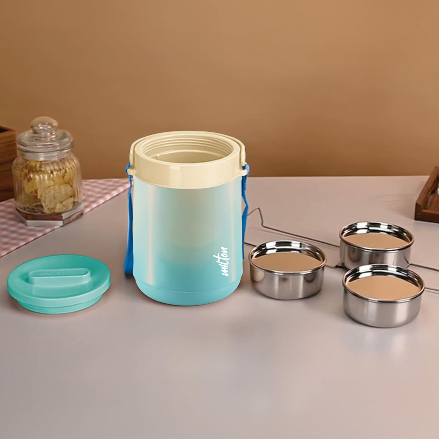 • Color: Aqua Green; Material: Steel Containers, Plastic Insulated Lifter; Package Content: 1 - Piece Gradient Tiffin 3 (900 ml); Dimension in cms (L x W x H): 15.6 x 15.6 x 18.8