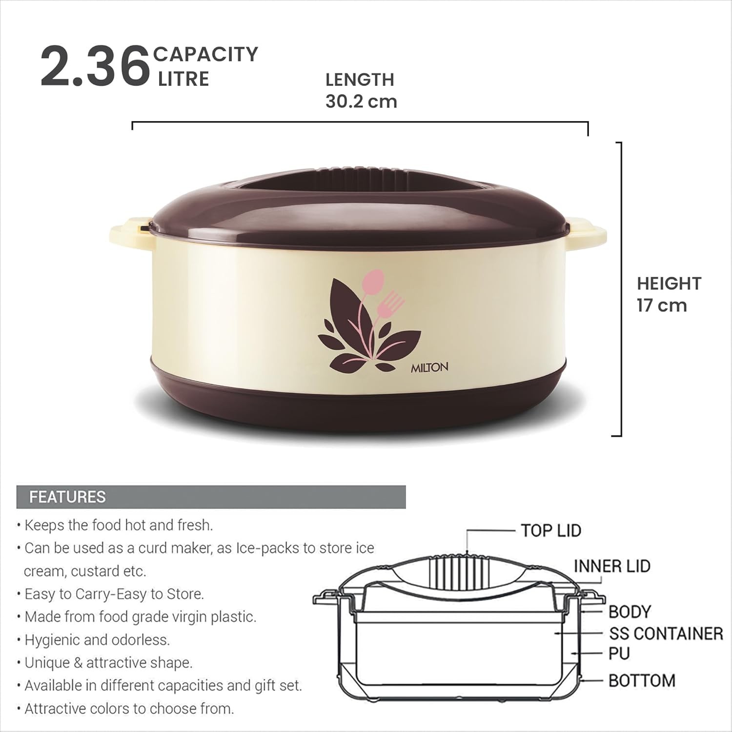 • Colour: DARK Brown, Material: Inner Stainless Steel; Package Contents: 1 - Piece Orchid Casserole (2360 ml), Dimension in cms (L x W x H): 30.2 x 30.2 x 17.