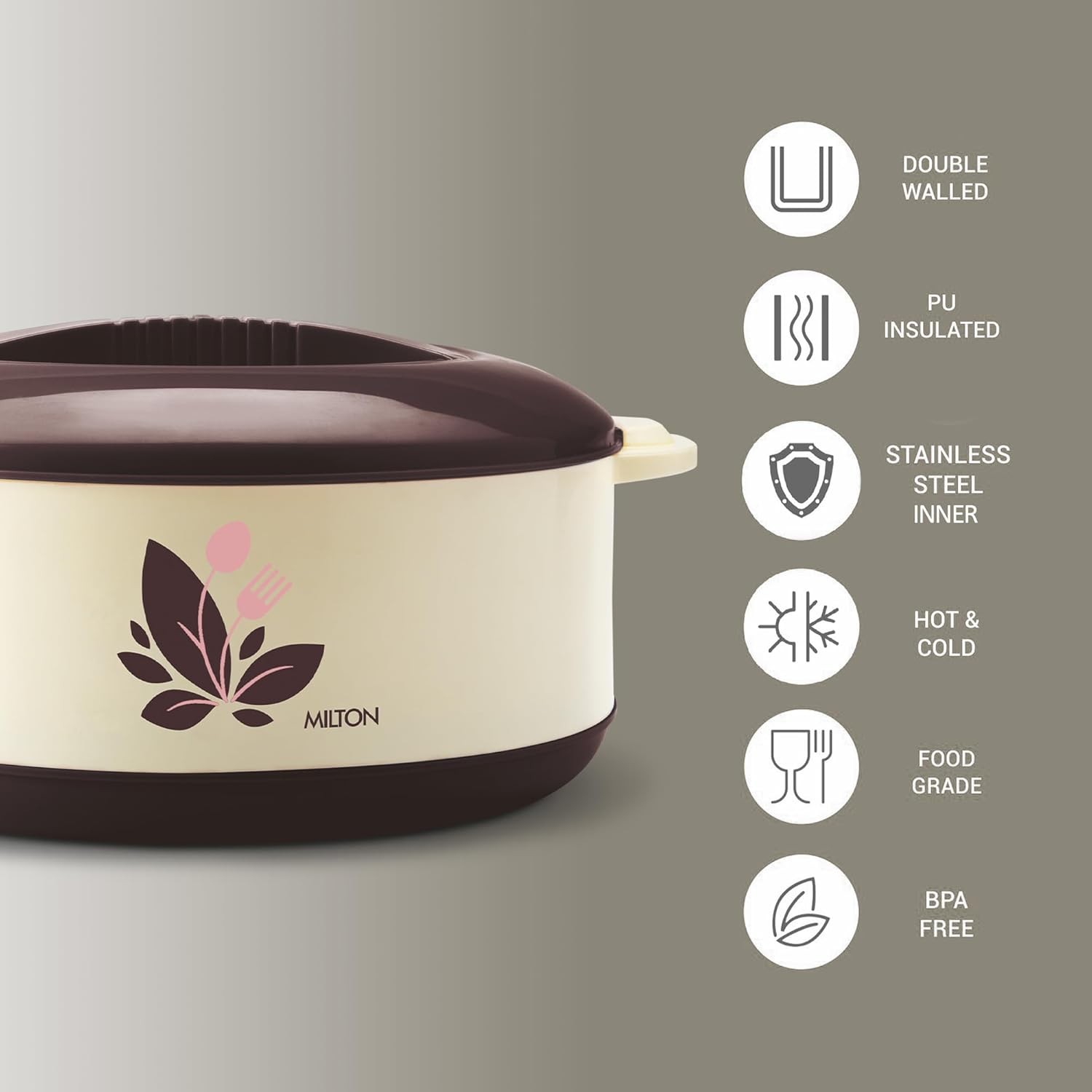 • Contemporary dual-tone outer finish with attractive graphics make mealtimes fun and exciting. Easy to carry from kitchen to dining table with an eye catching design featuring inner stainless steel